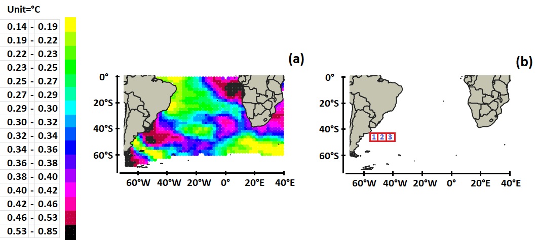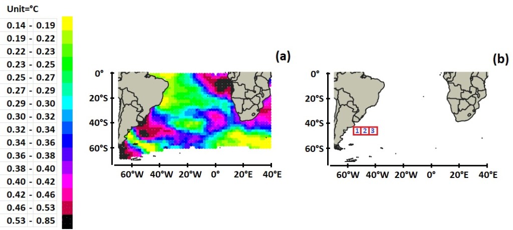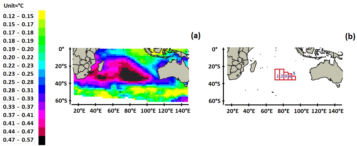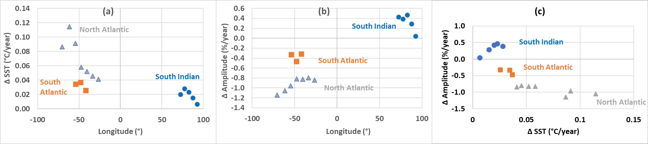 En revanche, la glace de mer Antarctique étant moins affectée par le réchauffement climatique, le gradient thermique entre les haute et basse latitudes des deux gyres de l’hémisphère sud est également moins affecté. La rétroaction sur l’amplitude des ondes gyrales est donc moindre. En ce qui concerne les deux gyres de l’hémisphère sud, la différence des réponses de l’amplitude de l’onde gyrale au réchauffement climatique s’explique par la différence de température de surface de la mer aux hautes latitudes, 12.1 °C dans l’Atlantique Sud et 20.4 °C dans le sud de l’océan Indien. Ainsi, la réponse des ondes gyrales à la rétroaction positive est moindre dans le sud de l’océan Indien que dans le sud de l’océan Atlantique (la température de surface de la mer moyenne est de 16.6 °C dans le nord de l’océan Atlantique).