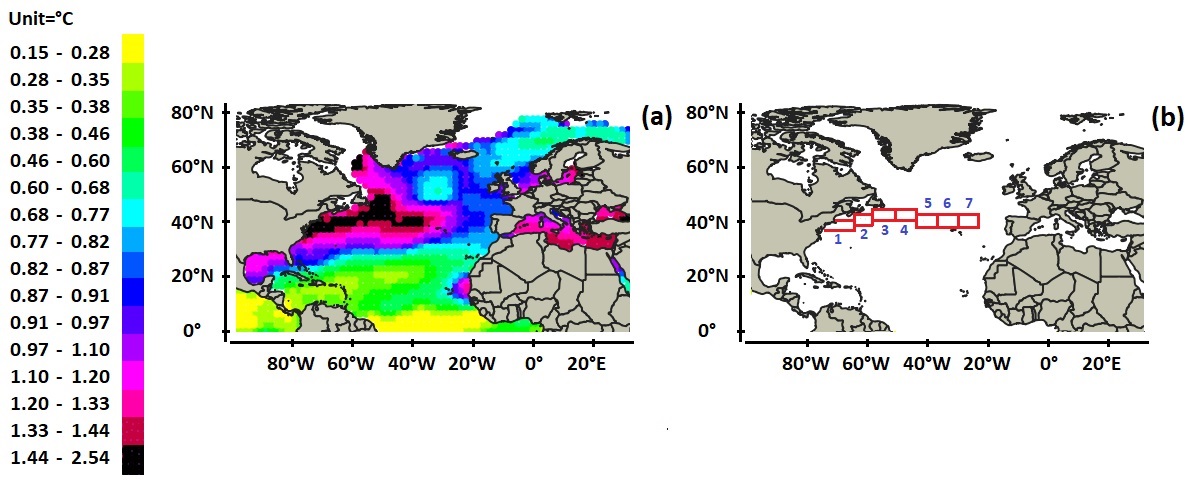 L’étude comparative des trois gyres subtropicaux, du nord et sud Atlantique et du sud de l’océan Indien, nécessite une régionalisation des anomalies thermiques de surface (SST) (Pinault, 2023). Concernant le Gulf Stream, la crête de l’anomalie de la SST dans la plage de période de 48 à 96 ans est représentée sur la Figure 1a. La crête est obtenue par l’analyse en ondelettes de la SST dans la plage de périodes de 48 à 96 ans. La partie principale du Gulf Stream concernée se situe de la côte nord-américaine jusqu’à sa division entre la branche continuant vers l’est en suivant le gyre nord atlantique et la branche migrant vers le nord, qui donne naissance au courant de dérive nord atlantique. Sept régions sont définies le long de la crête (Figure 1b).