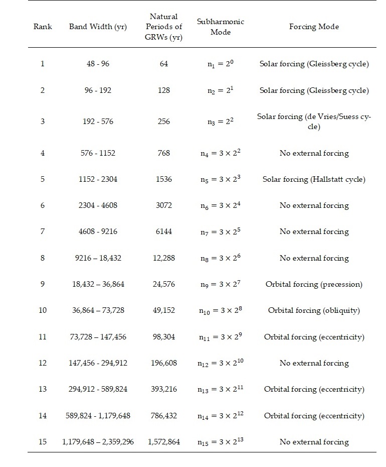 Les ondes gyrales effectuent un tour autour des gyres Nord et Sud Atlantique, et autour du gyre de l’Océan Indien en 64 ans, en 128 ans autour des gyres Nord et Sud Pacifique. La résonance des ondes de Rossby se produit en modes subharmoniques comme indiqués dans le tableau (pour les ondes s’enroulant autour des gyres subtropicaux). Ils sont obtenus par récurrence, tout mode étant déduit du précédent en le multipliant par 2 ou 3, ce qui correspond à une stabilité optimale des ondes de Rossby gyrales. Ce facteur multiplicatif est déduit de longues séries chronologiques du climat (carottes de glace et de sédiments).